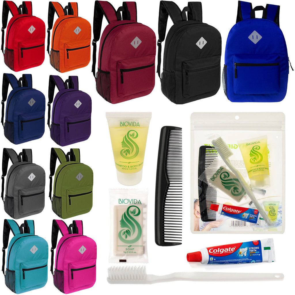 This wholesale care package is a great item for the homeless as it combines our popular diamond patch 17" backpacks with bulk hygiene kits. The solid color 17 inch wholesale backpacks come in 11 assorted colors and features padded and adjustable straps and a mesh side pocket. There are 15 different choice of bulk hygiene kits to choose from so you can find the one that fits your needs the best. All orders come with free shipping and tiered discount pricing!