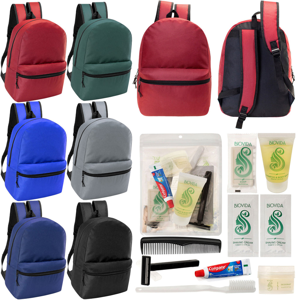 This essential bulk care package for the homeless community combines wholesale hygiene kits of your choice along with our 17 inch basic 19 inch wholesale backpacks. The spacious bulk backpacks come in 12 different colors and features a large main compartment and front pocket along with reinforced, padded and adjustable straps. There are 15 different choice of wholesale hygiene kits to choose from so you can find the one that fits your needs the best. All orders come with free shipping and tiered discount pricing!