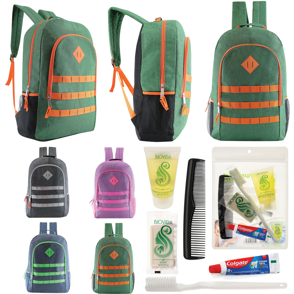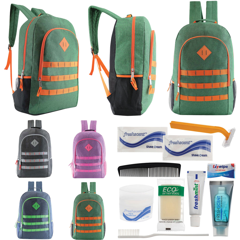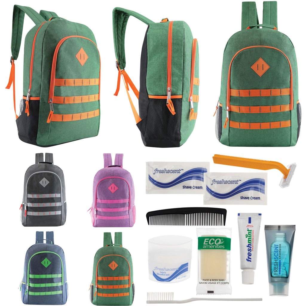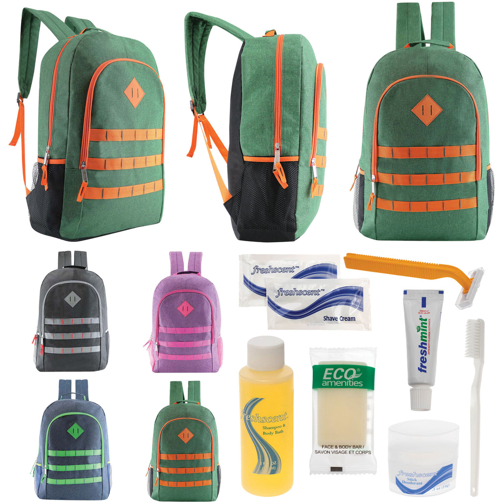 This combo pack includes 12 of our premium 19 inch backpacks that features 2 mesh side pockets and 12 bulk hygiene kits. There are many different kits that have various essential hygiene items that are perfect for homeless care donations and giveaways. Perfect for emergency situations as well, these wholesale care packages come with free shipping and bulk discount pricing.