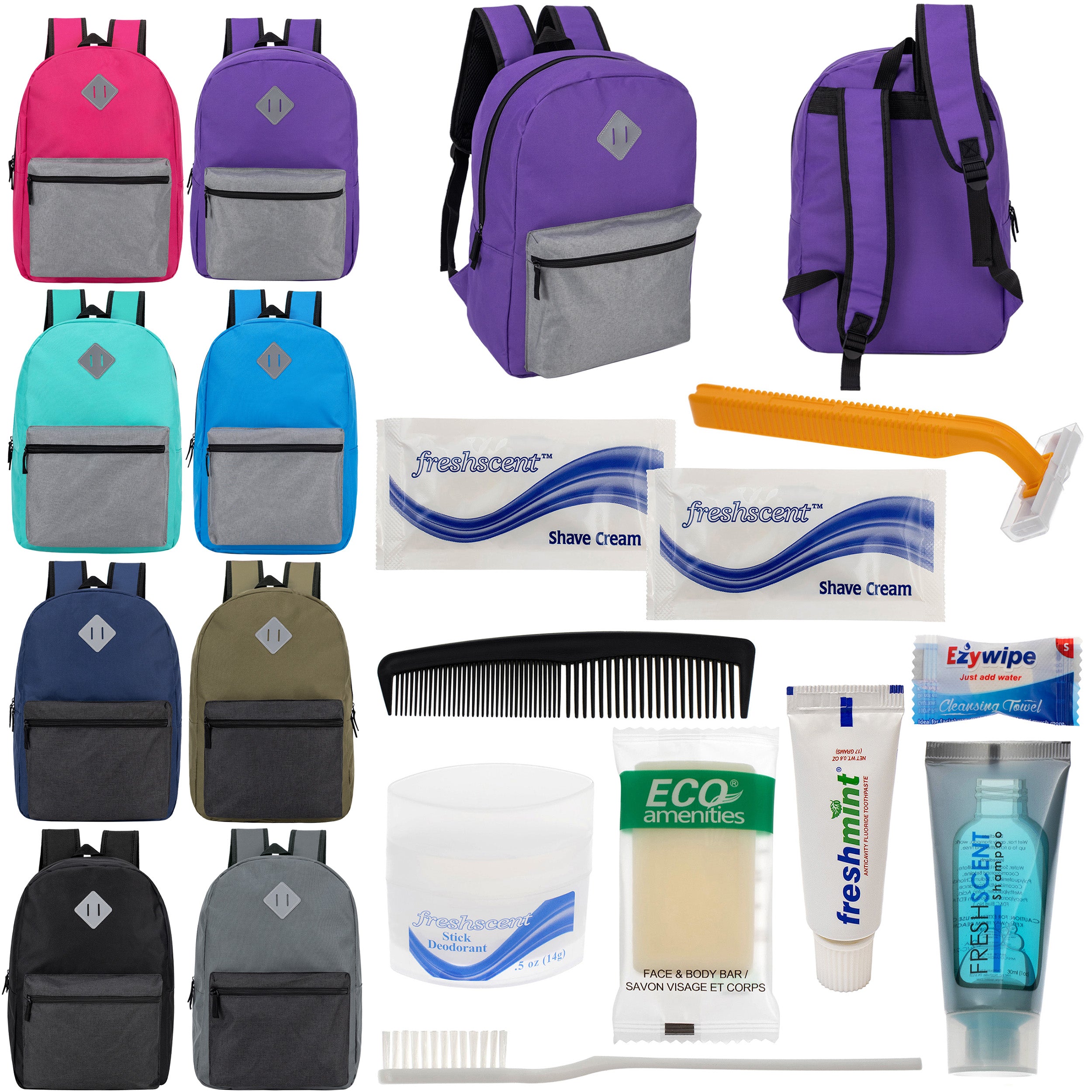 This essential bulk care package for the homeless community combines wholesale hygiene kits of your choice along with our 17 inch unisex wholesale backpacks. The bulk backpacks come in 8 different color combinations and features a diamond patch design along with reinforced, padded and adjustable straps. There are 15 different choice of wholesale hygiene kits to choose from so you can find the one that fits your needs the best. All orders come with free shipping and tiered discount pricing!
