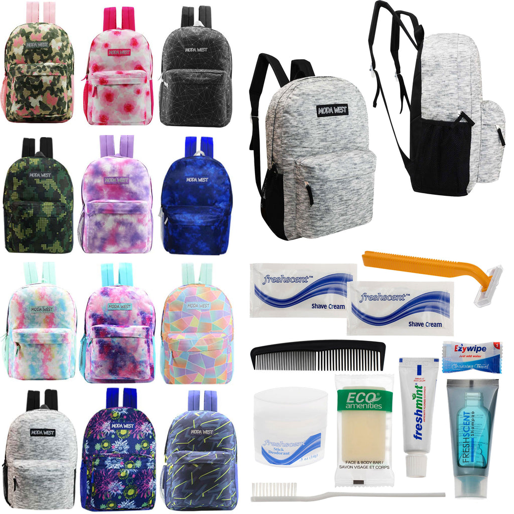 Wholesale care packages are great for the homeless community. This care box combines our popular 17" backpacks in assorted patterns featuring a mesh side pocket with bulk hygiene kits. Our bulk hygiene supplies come in pre-packaged kits so you can choose the one that fits your needs the best. All orders come with free shipping and tiered discount pricing!