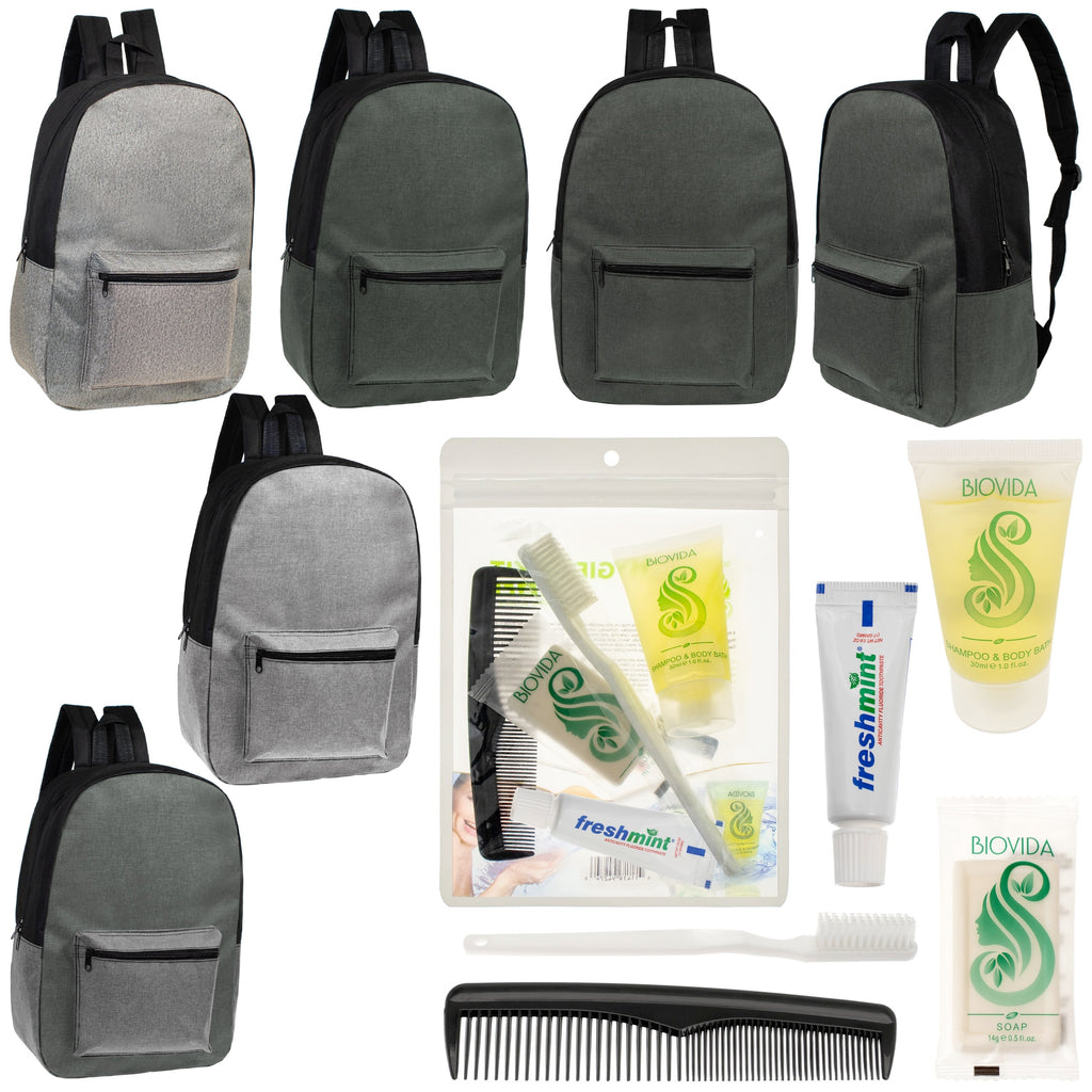 You get 12 wholesale hygiene kits of your choice along with our 17 inch unisex bulk backpacks in 4 assorted colors. Great price on this essential wholesale care box in bulk for the homeless. The sturdy wholesale backpacks features padded adjustable straps and a large main compartment and front pocket. There are 15 different choice of wholesale hygiene kits to choose from so you can find the one that fits your needs the best. All orders come with free shipping and tiered discount pricing!