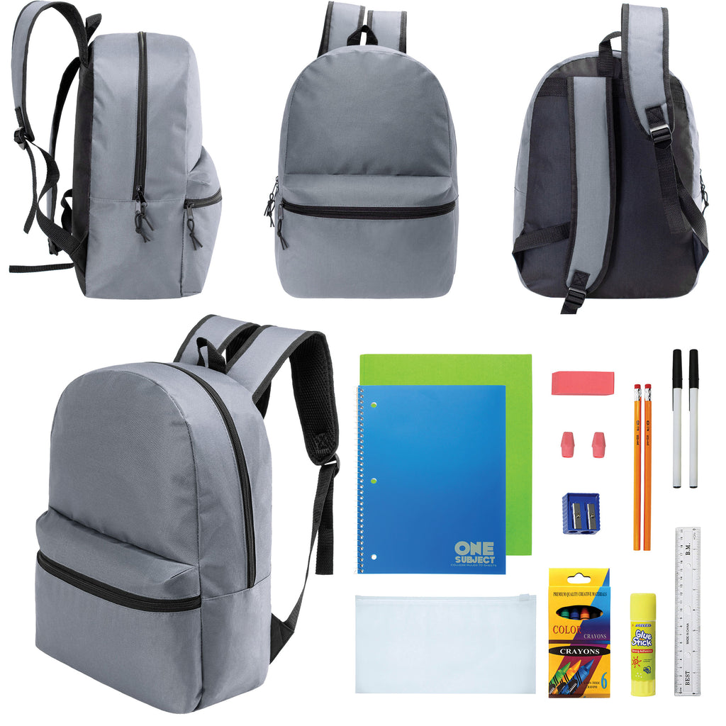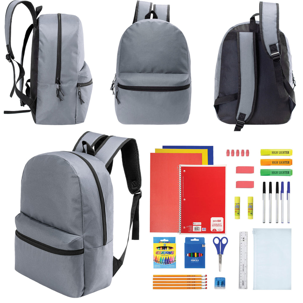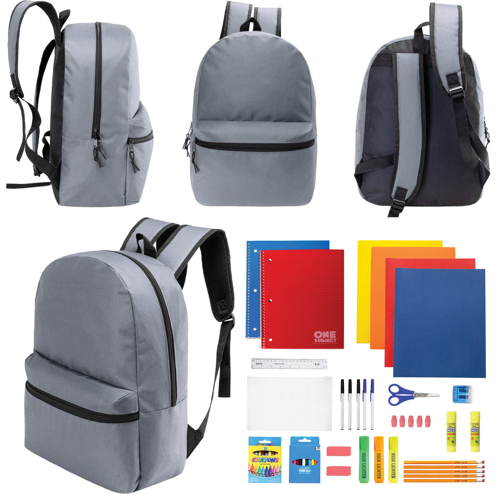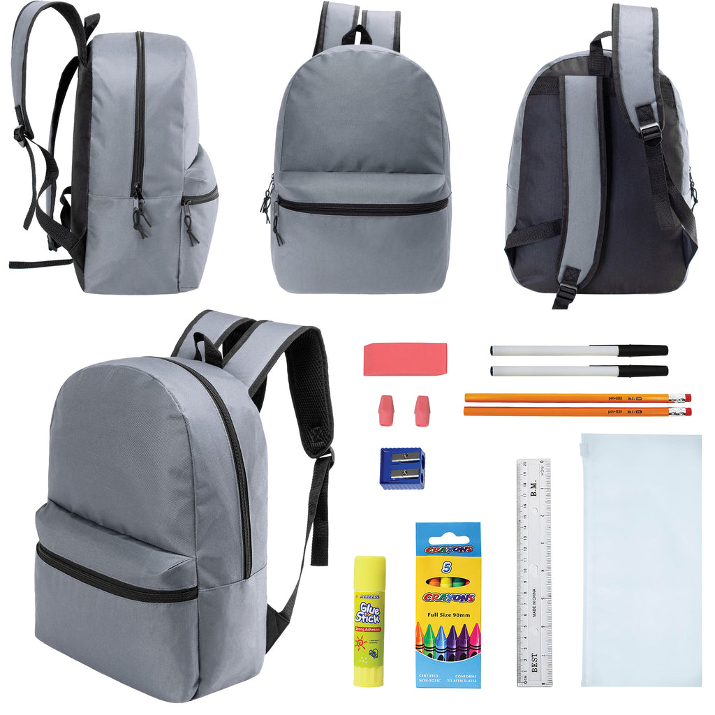 This back-to-school student box includes 12 wholesale 17" classic backpacks and 12 bulk school supply kits. The 17" bookbag comes in a cool gray which is great for both boys and girls and students of any age. It includes a large main compartment, wide front pocket, carry handle, dual zippers and adjustable padded straps with reinforced stitching for long lasting wear. The wholesale school supplies come in 7 different kits to choose from so you can get the one that best fits your needs.