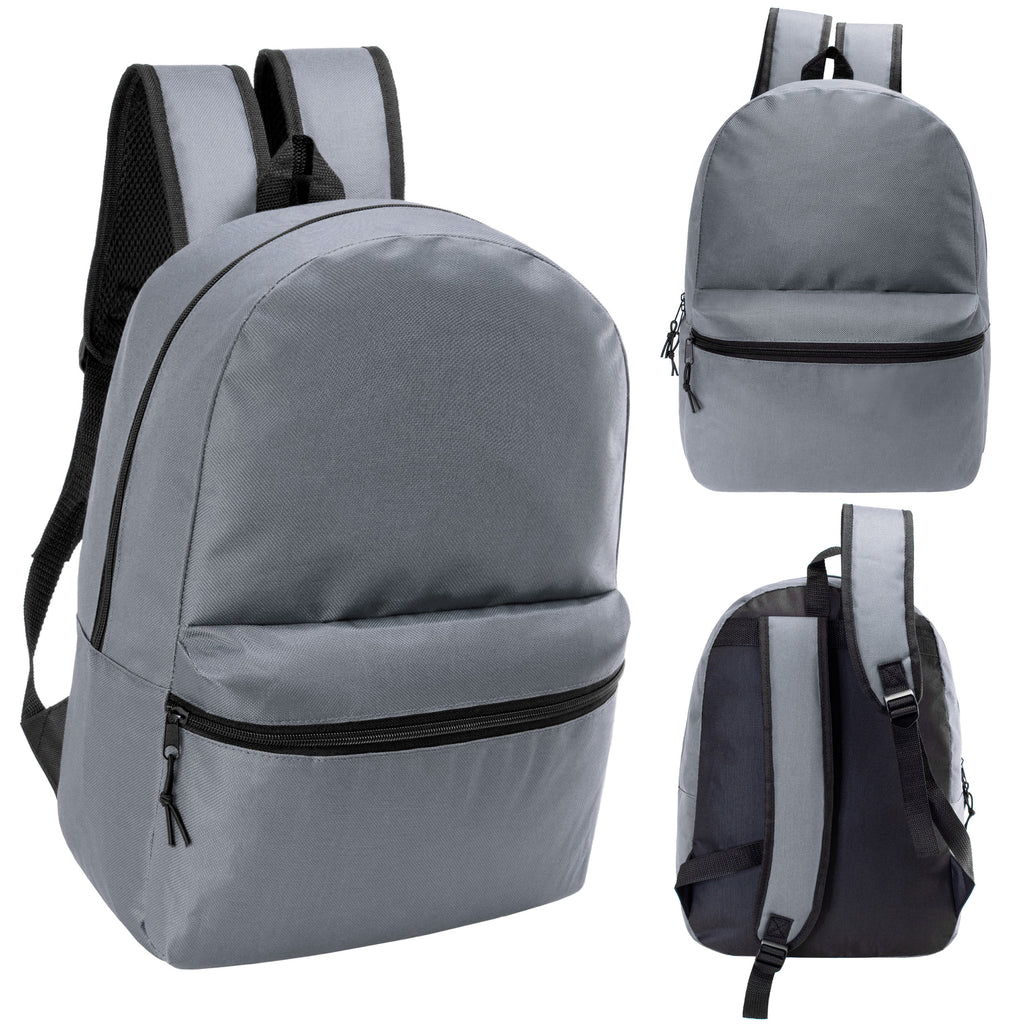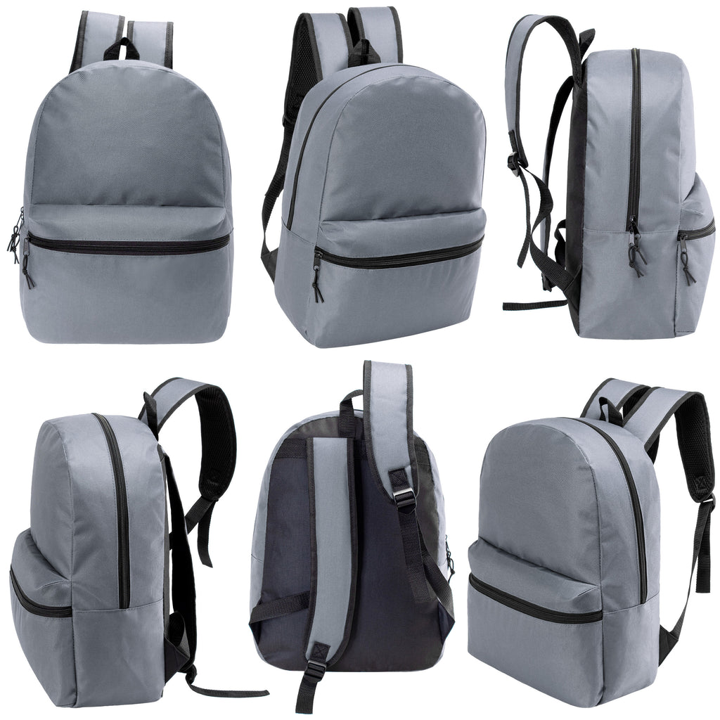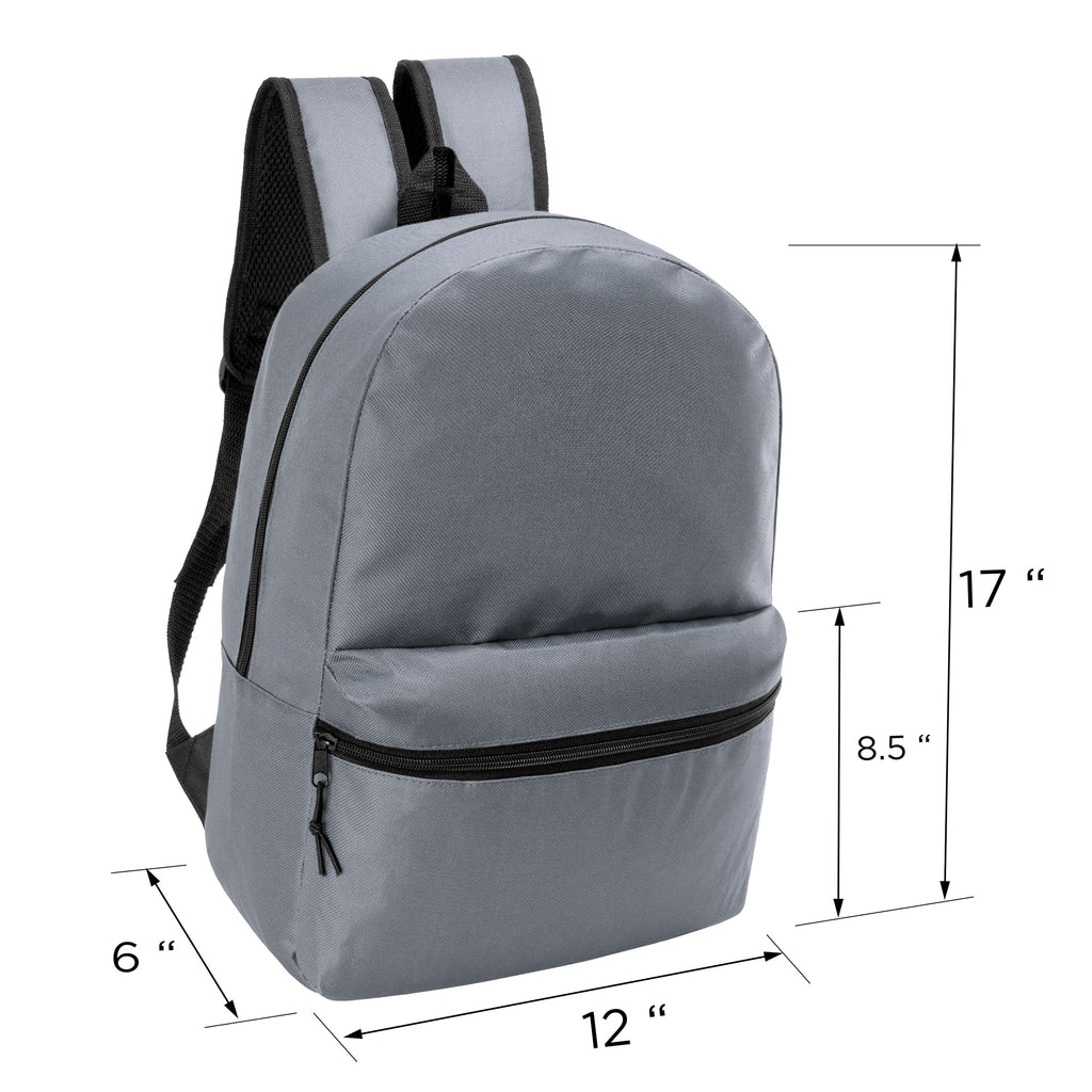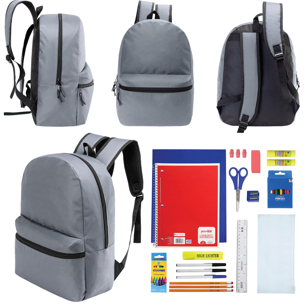 This back-to-school student box includes 12 wholesale 17" classic backpacks and 12 bulk school supply kits. The 17" bookbag comes in a cool gray which is great for both boys and girls and students of any age. It includes a large main compartment, wide front pocket, carry handle, dual zippers and adjustable padded straps with reinforced stitching for long lasting wear. The wholesale school supplies come in 7 different kits to choose from so you can get the one that best fits your needs.