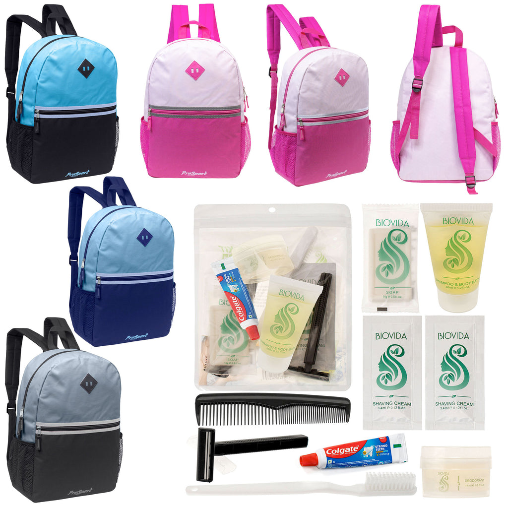 Free shipping and tiered discount bulk pricing on this vital wholesale care package that is ideal for charity donations for the homeless community. You get 12 of our 17 inch multi color wholesale diamond patch backpacks in 3 color combinations with accent trim. This backpack features dual mesh side pockets and 2 zipper close compartments and dual mesh side pockets along with padded and adjustable straps. These bookbags are unisex and are perfect for women or men. You also get 12 bulk hygiene kits with 15 different kits to choose from so you get the perfect kit for your needs. All kits come neatly packed in resealable plastic bags.