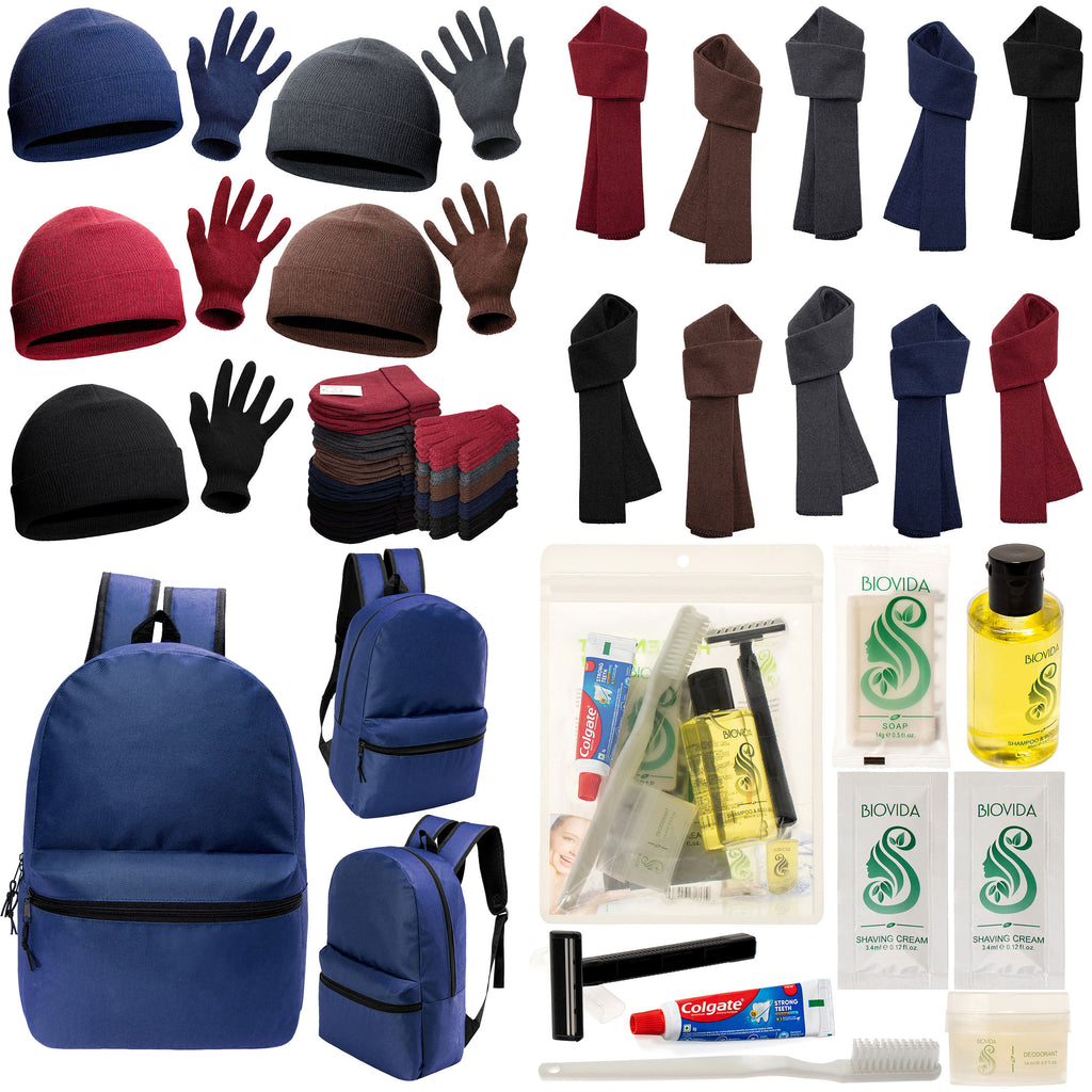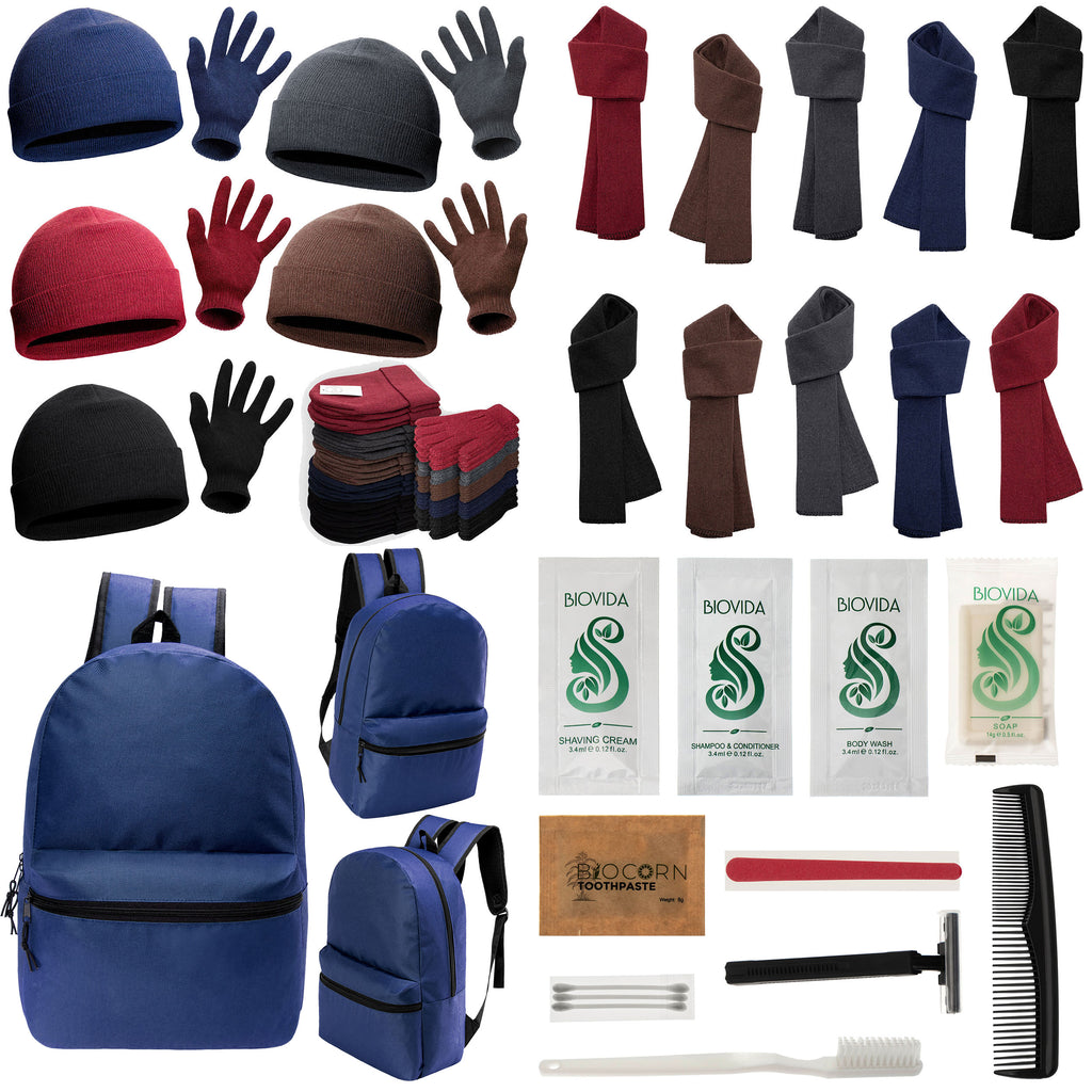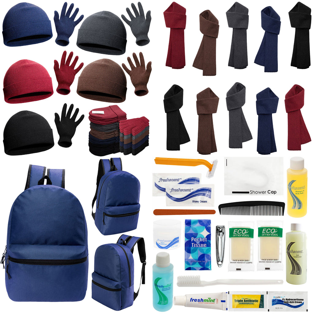 This combo wholesale care package for the homeless features our 17 inch basic backpack in navy blue that is great for both women and men. Get this backpack with your choice of many different hygiene kits and also get warm winter gloves, scarves and beanies. You get 12 of each item making this an excellent purchase for charity donations for the unhoused during the coldest months of the year. Your purchase comes with free shipping and bulk volume discount pricing.