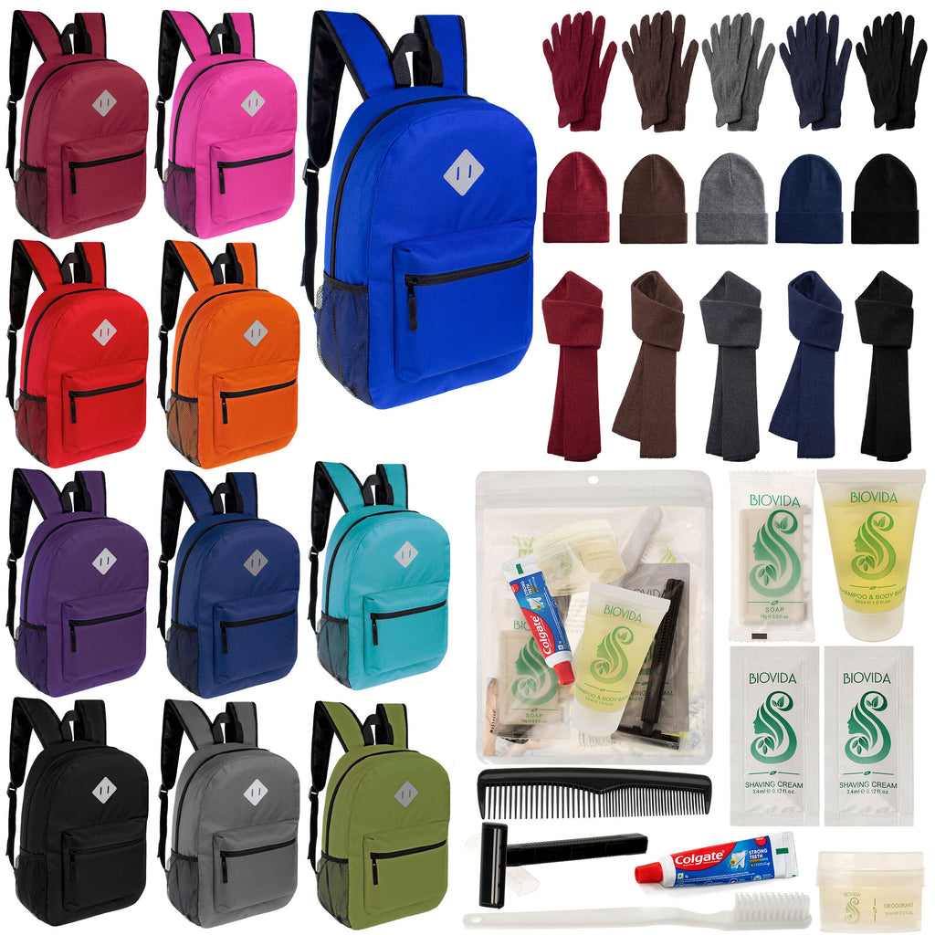 This wholesale care package is a great item for the homeless as it combines our popular diamond patch 17" backpacks with bulk hygiene kits and winter items including gloves, beanies and scarves. The solid color 17 inch wholesale backpacks come in 11 assorted colors and features padded and adjustable straps and a mesh side pocket. There are 15 different choice of bulk hygiene kits to choose from so you can find the one that fits your needs the best. All orders come with free shipping and tiered discount pricing!