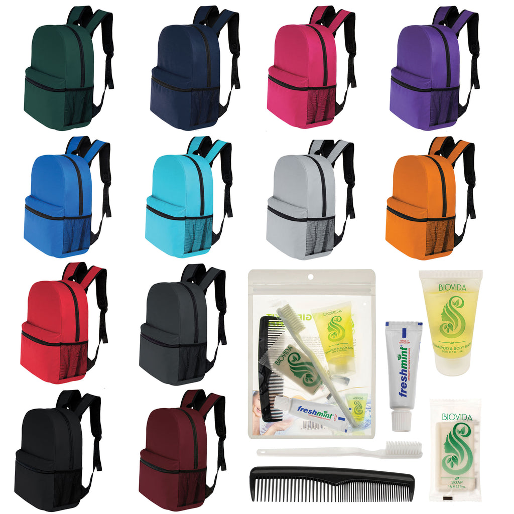 This vital wholesale package for the homeless combines our classic 17" backpacks in 12 assorted solid colors with bulk hygiene kits. The unisex 17 inch wholesale backpacks feature a mesh side pocket, reinforced padded and adjustable straps, a large main compartment and a spacious front pocket. There are many different choices of bulk hygiene kits to choose from so you can find the one that best fits your needs. All of our bulk orders come with free shipping and bulk tiered discount pricing!