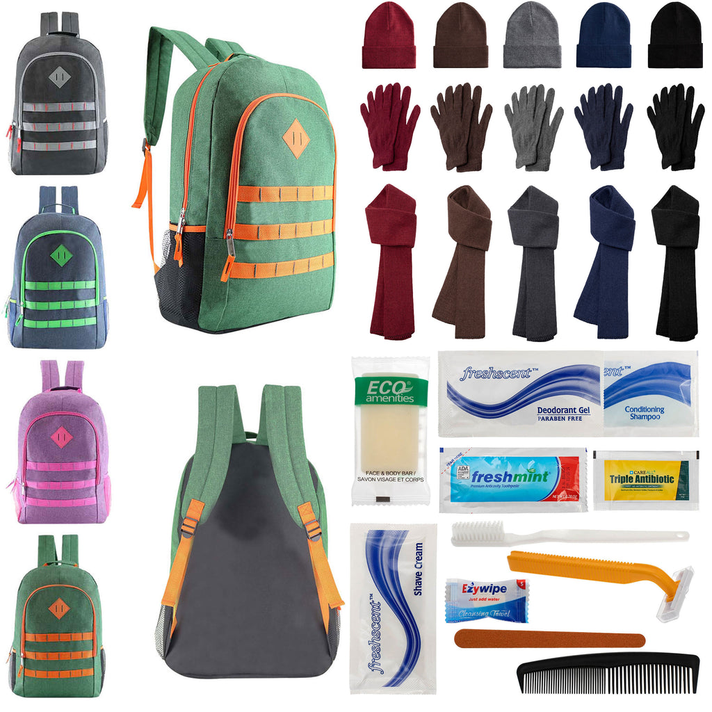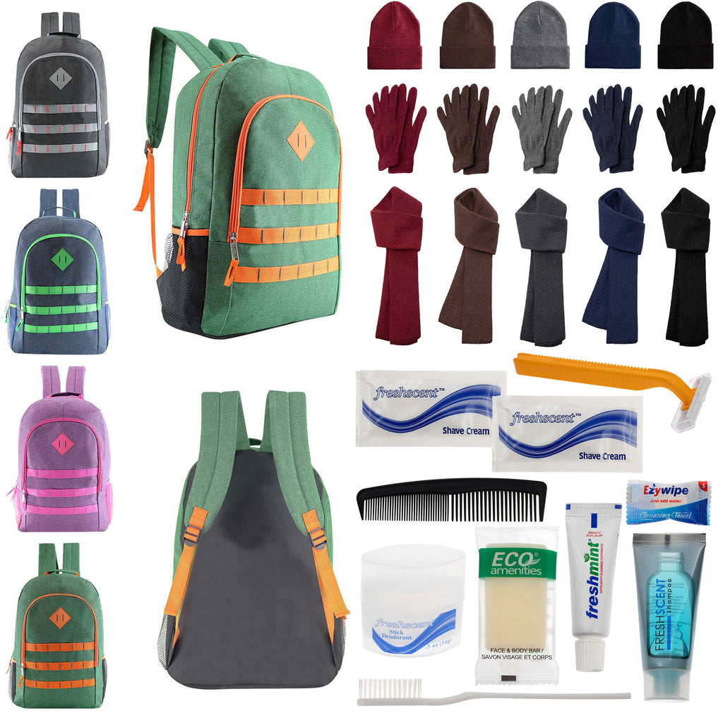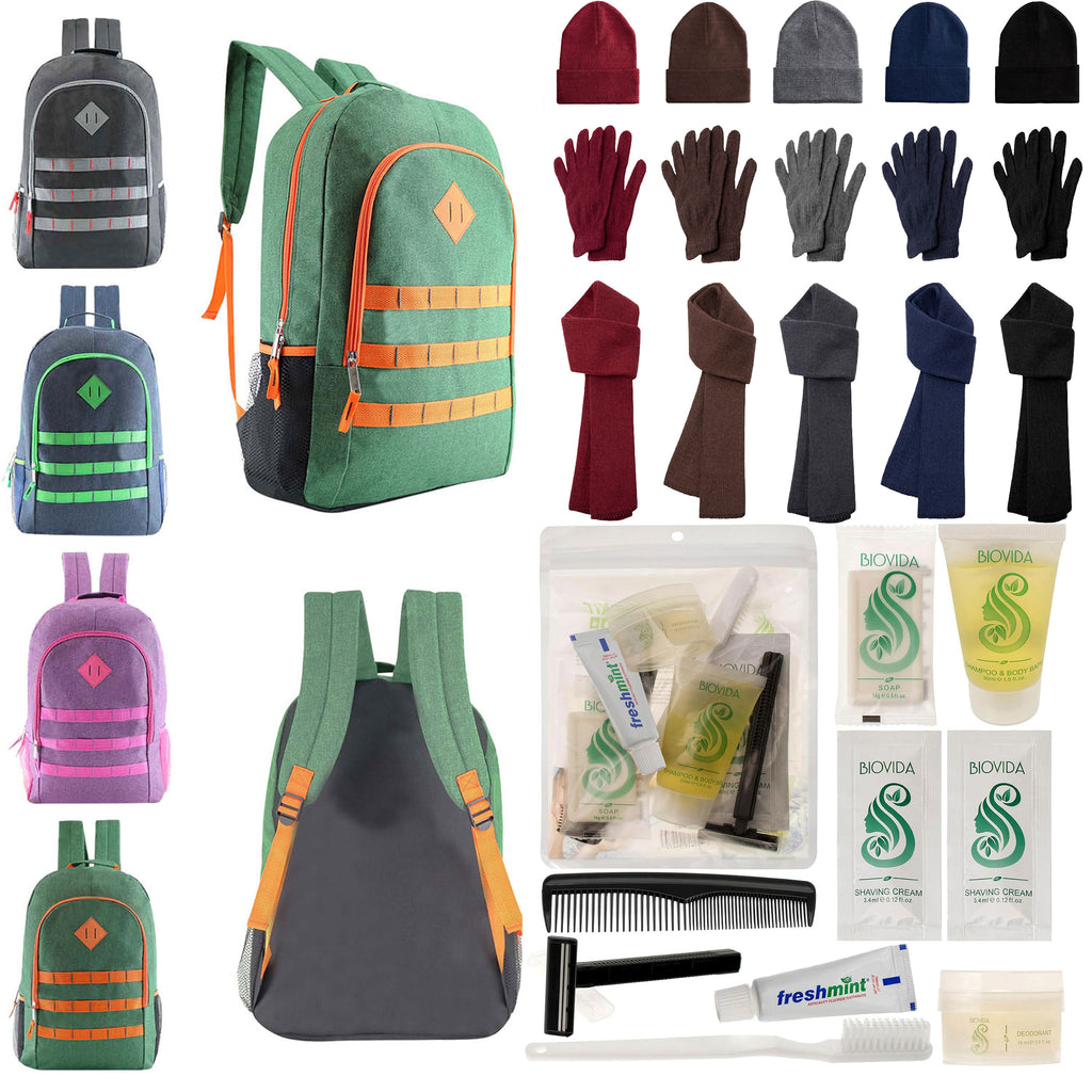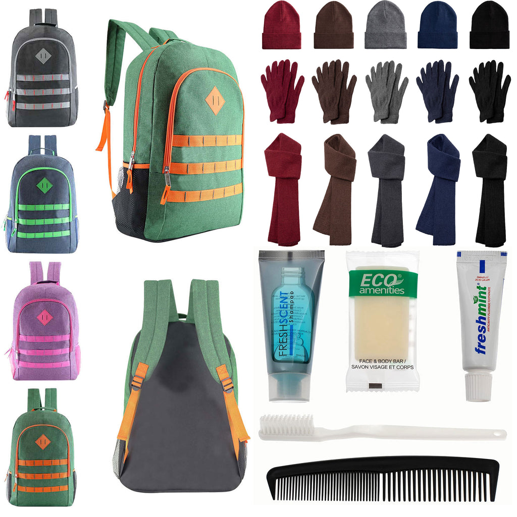 You get 12 deluxe 19 inch backpacks featuring 2 mesh side pockets and 2 large storage compartments along with 12 hygiene kits and 12 each of gloves, scarves and hats. This wholesale winter care package is essential for the homeless community during the coldest months of the year. This bulk package comes with discount volume pricing and free shipping.