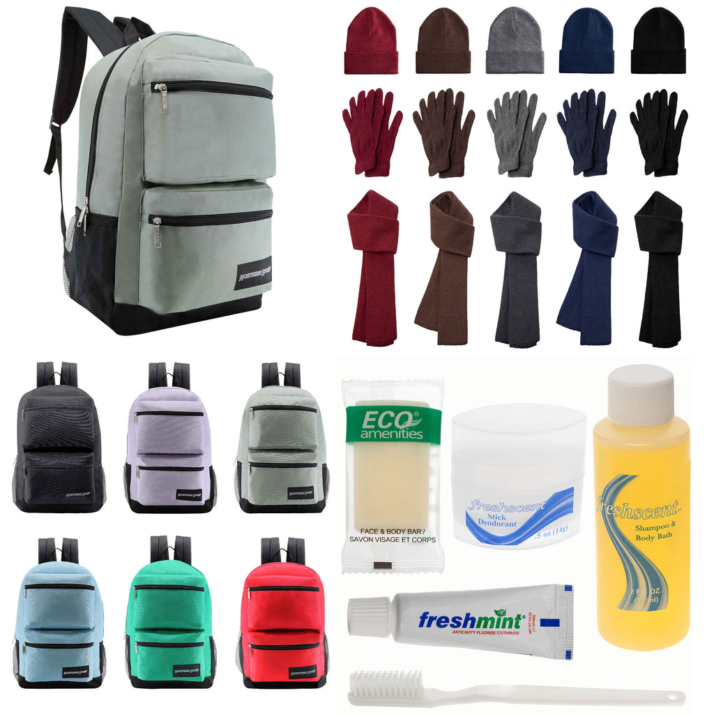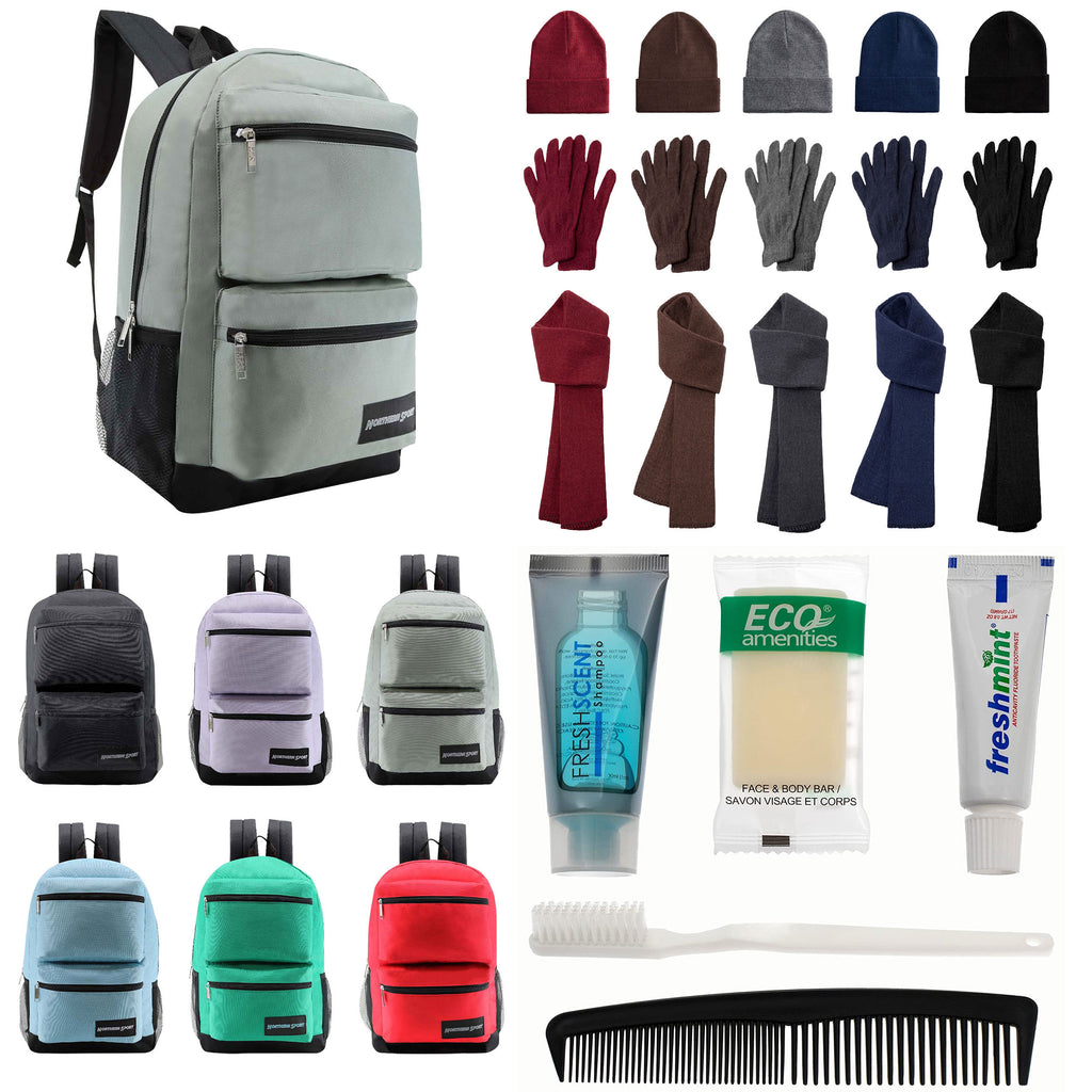 You get 12 premium large 19 inch backpacks featuring 2 mesh side pockets and 2 large front storage compartments as well as a spacious main compartment along with 12 hygiene kits and 12 each of gloves, scarves and hats. This wholesale winter care package is essential for the homeless community during the coldest months of the year. This bulk box comes with discount volume pricing and free shipping and is perfect for charity donations.