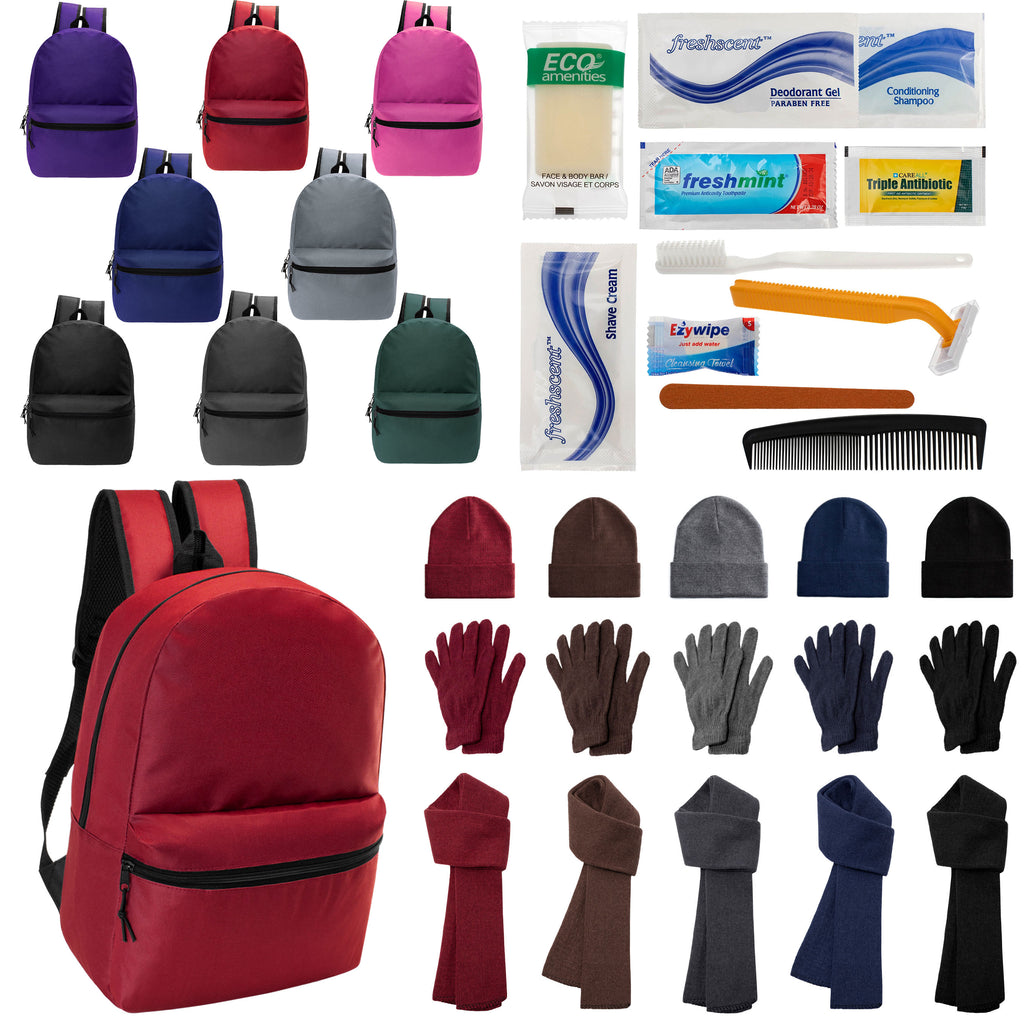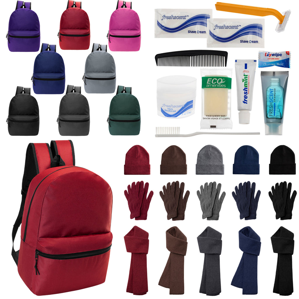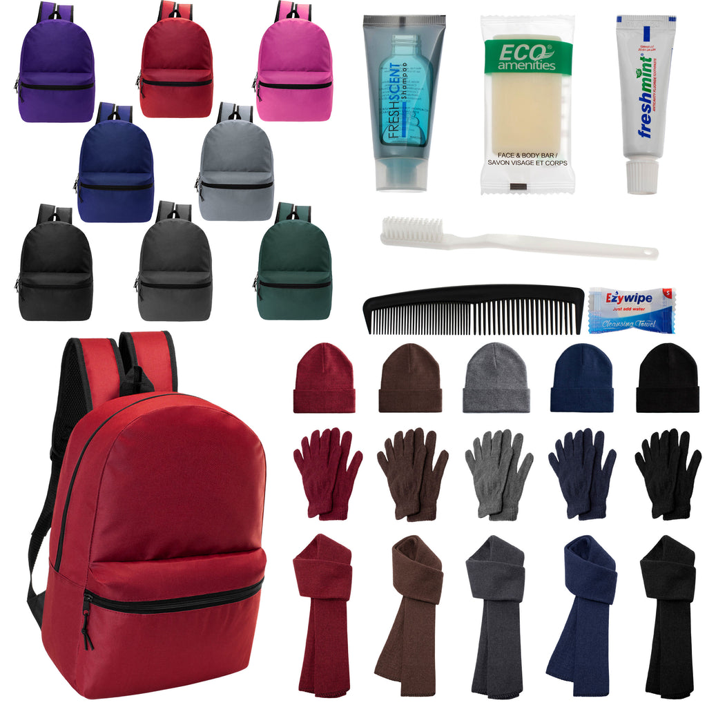 This combination wholesale care box for the homeless features our unisex 17 inch basic backpack shipped with 8 assorted colors. This backpack is combined with your choice of many different hygiene kits and also comes with warm winter gloves, scarves and beanies. You get 12 of each item making this an excellent purchase for charity donations for the homeless during the coldest months of the year. Enjoy free shipping and bulk volume discount pricing.